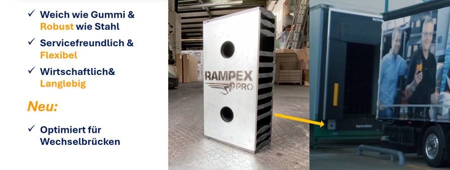 RAMPEX-PRO kombiniert dank seiner patentierten Lamellenkonstruktion die Vorteile anderer Puffer, aber ohne deren Nachteile. Die Elastomer Lamellen bremsen andockende LKWs zuverlässig und sanft ab, während die massive Frontplatte aus Stahl den Verschleiß auf ein Minimum reduziert. Auf- und Abwärtsbewegungen des LKW beim Be- und Entladen macht unser Puffer ebenso mit, wie versehentlich auf dem Puffer abgestellte Wechselbrücken.